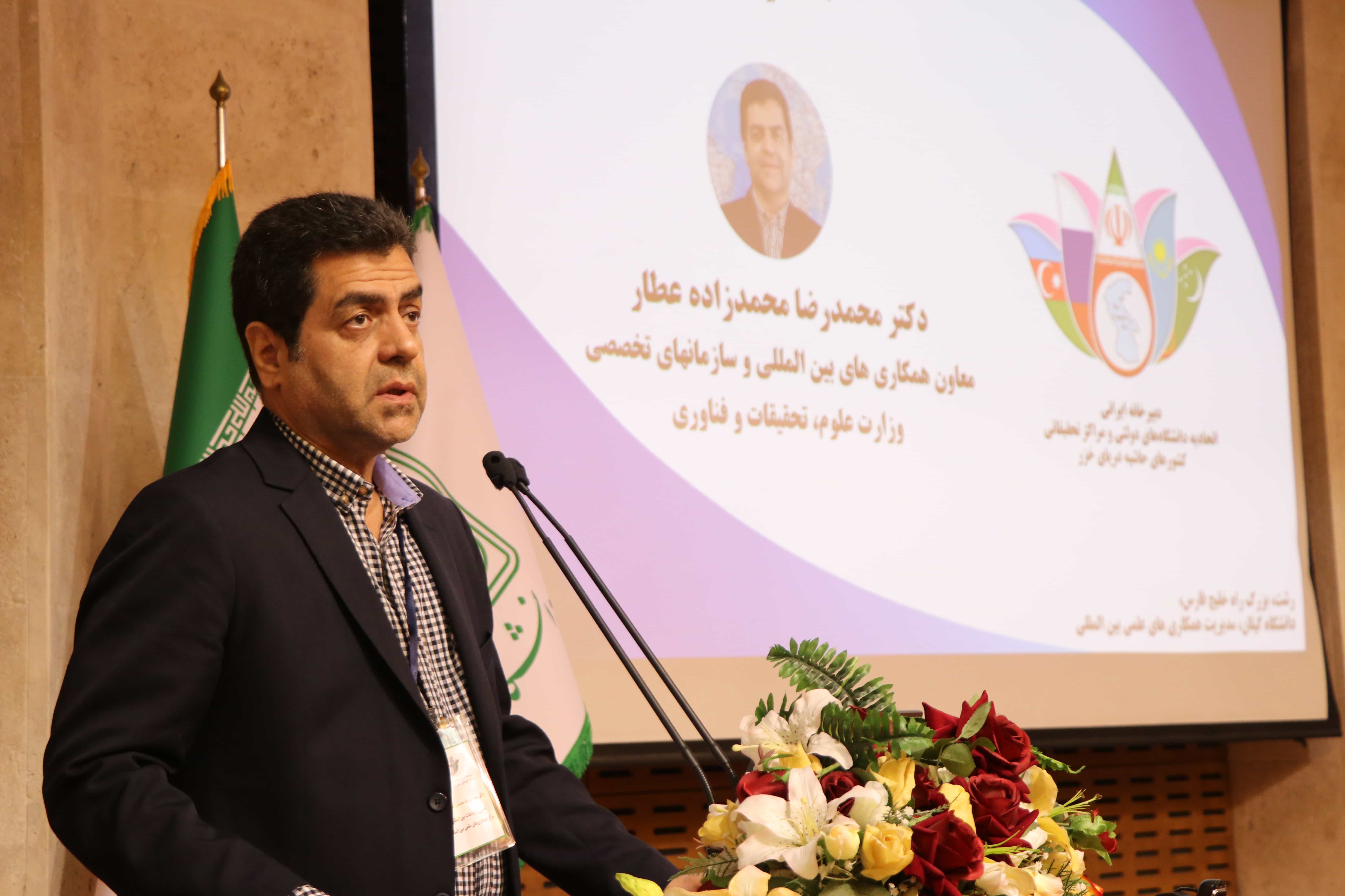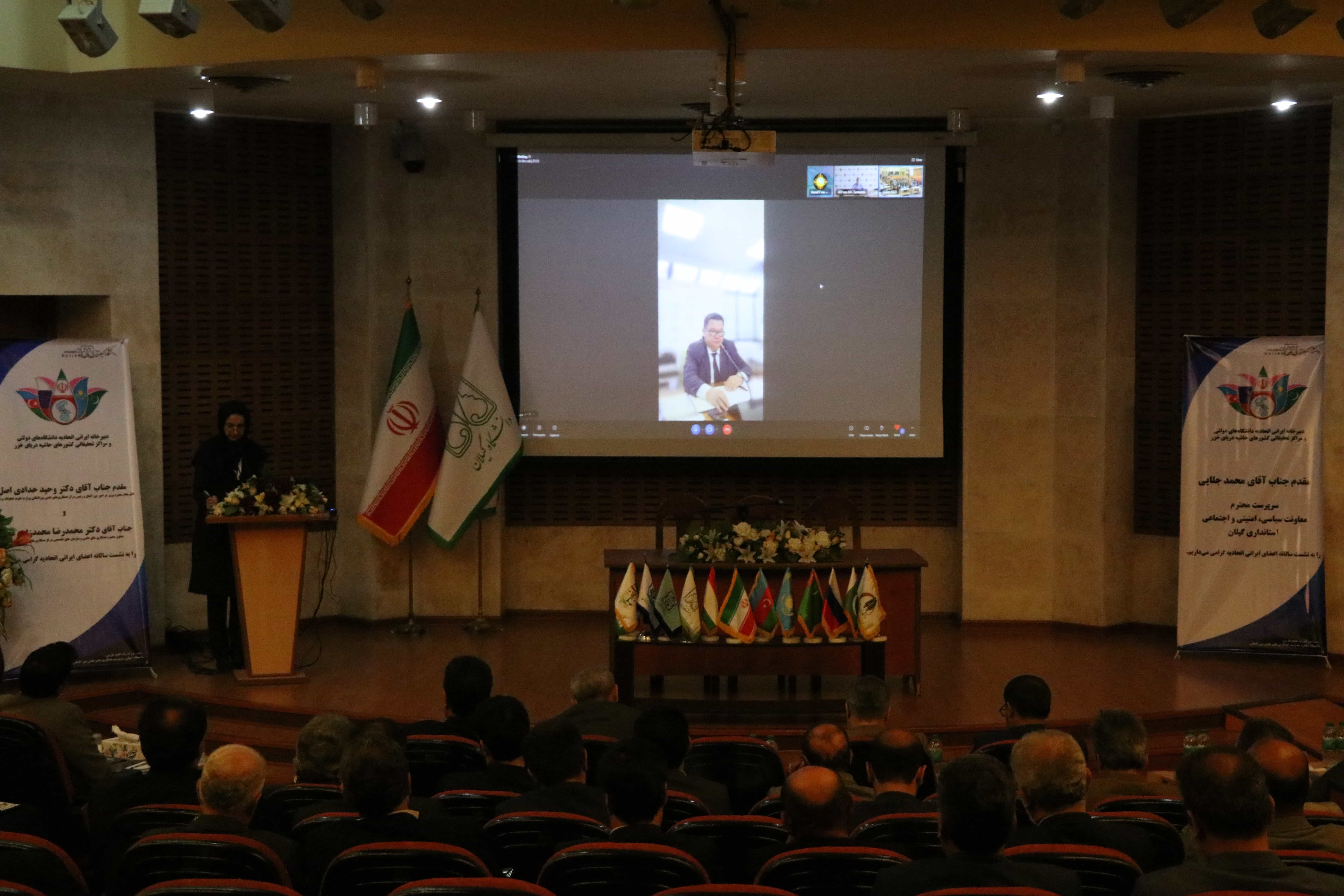 رئیس دورهای اتحادیه و رئیس دانشگاه کالمیکیا و همچنین معاون بینالملل دانشگاه دولتی آستراخان فدراسیون روسیه از مهمانان بینالمللی این نشست بودند. دکتر بادما سالایف (رئیس اتحادیه) در این جلسه، اتحادیه را یک فرصت بینظیر برای گسترش و تقویت همکاریهای بینمنطقهای و بینالمللی عنوان کرد و افزود: دانشگاهها محلی برای برگزاری رویدادهای علمی و علمی-عملی تبدیل شده و جامعه علمی و آموزشی دانشگاهها و موسسات تحقیقاتی کشورهای حاشیه کاسپین را متحد میکند. وی همچنین از دانشگاه گیلان برای مساعدت انجام شده در خصوص رفع مشکل جذب استاد آموزش زبان فارسی در دانشگاه کالمیکیا قدردانی نموده و عملکرد استاد اعزام شده را موفقیتآمیز ارزیابی نمود. خانم دکتر فادینا (معاون بینالملل دانشگاه دولتی آستراخان) نیز ضمن معرفی عملکرد این دانشگاه بعنوان مسئول کمیته علم، تحقیقات و فناوری اتحادیه اذعان داشت که بایستی از تلاشهای دانشمندان جوان، بیشتر حمایت شود. وی ابراز امیدواری کرد که کمیته علم، تحقیقات و فناوری مبنای مهمی برای توسعه ارتباطات علمی بین محققان اتحادیه باشد و بعنوان پلی برای روابط دوستانه، دانشگاههای ما را با دانش جدید، اغنا نماید.